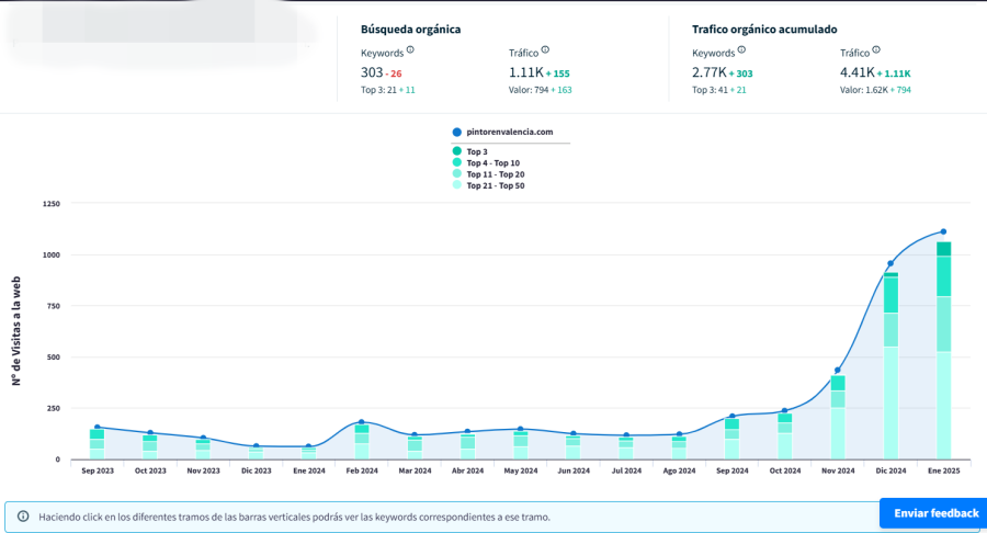 - Aumento de palabras clave posicionadas: +303 nuevas palabras clave en Google.